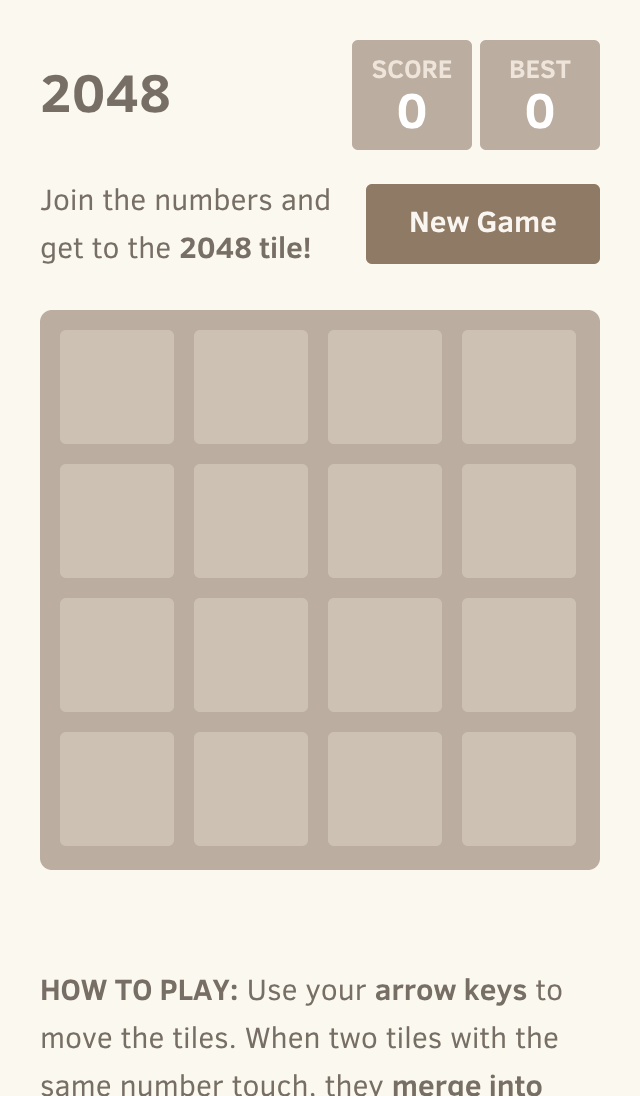 Use your arrow keys or swipe on mobile to move the tiles. When two tiles with the same number touch, they merge into one tile with double the value. The goal is to create the 2048 tile.